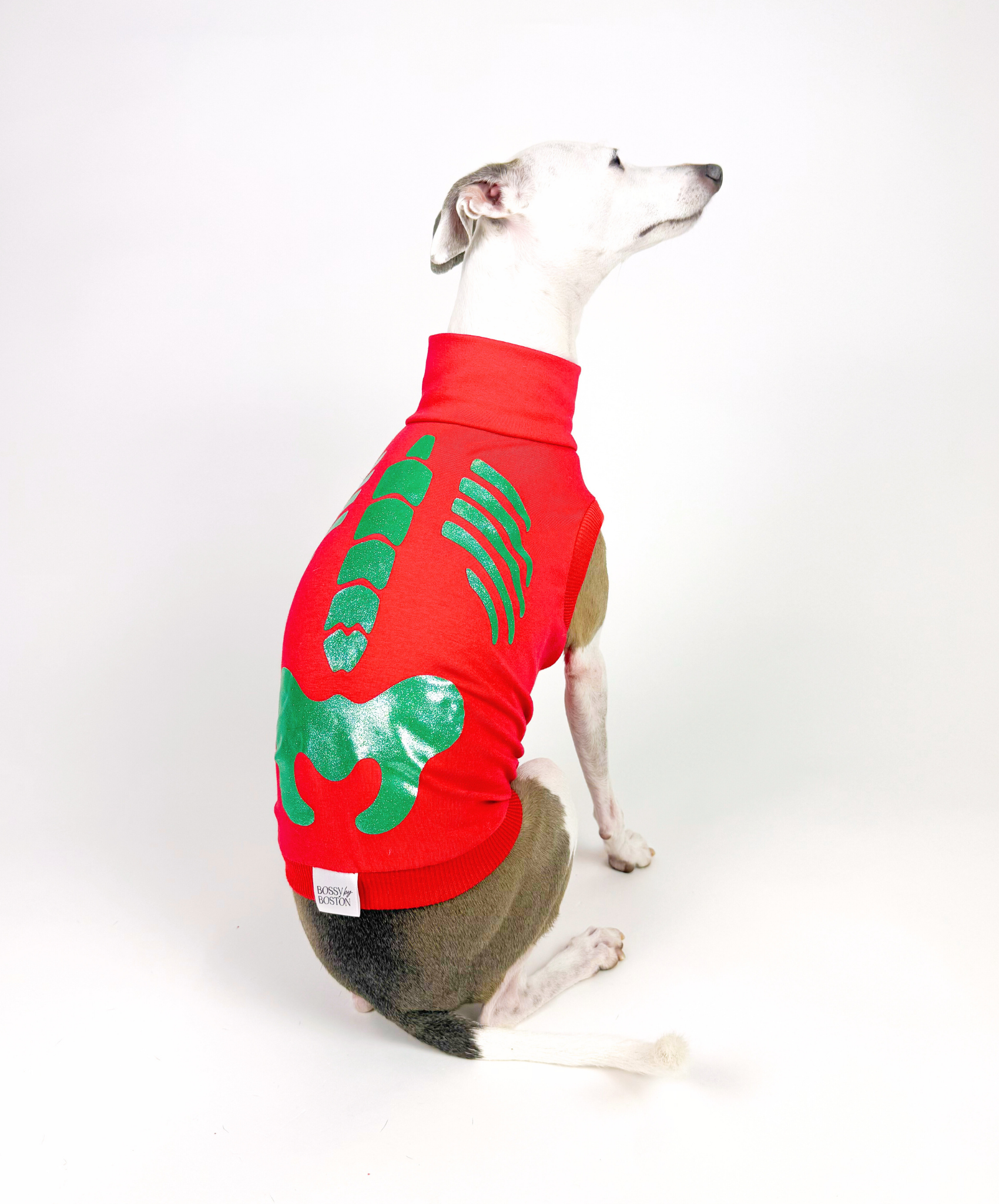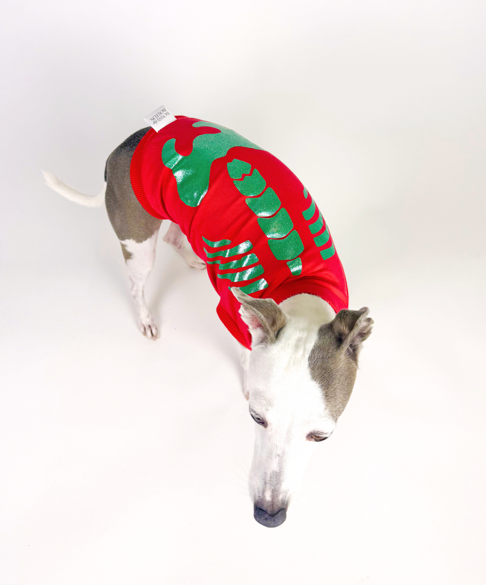 Get your hound ready to sleigh this season in the Howliday Skeleton, a festive reimagining of our cult-favourite skelly. Featuring shimmery green bones that sparkle in the sunlight, this sleeveless crop brings a cheeky mix of Christmas charm and Bossy attitude. Whether they’re posing under the tree or stealing the spotlight at your holiday party, this piece guarantees instant main-character energy.